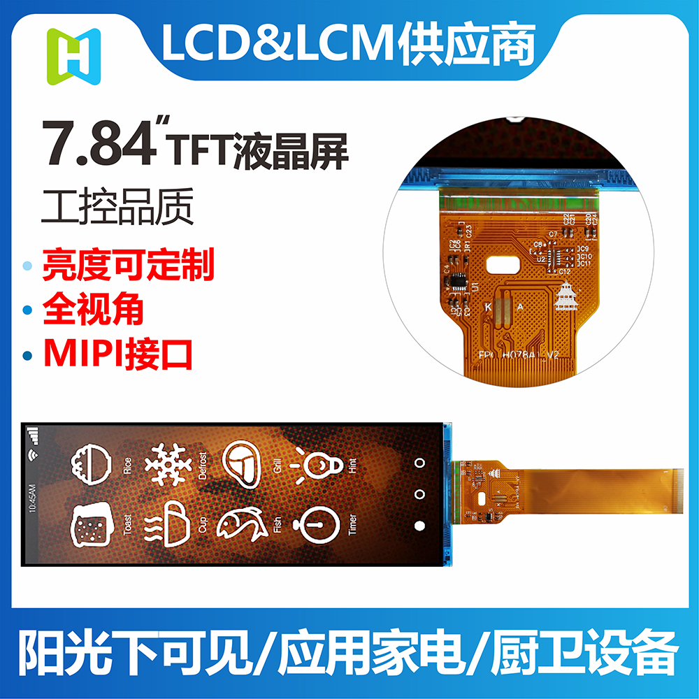 TFT-H078A1ZAISTN40 is a 7.84-inch TFT LCD module with IPS panel technology. This TFT-LCD has a resolution of 400 x 1280 pixels. The TFT-H078A1ZAISTN40 module has built-in ST7703 driver IC, supports MIPI interface, the contrast ratio is 700 (typical value), and the module brightness is 700 nits (typical value). H078A1 adopts IPS panel technology, the viewing angle is wider than TN glass, the left: 80 / right: 80 / top: 80 / bottom: 80 degrees, the color is vivid, and the high-quality picture is saturated and natural. The driving voltage of the H078A1 module is 3.3V, normal black/transmissive LCD, matte glass. The operating temperature of this module is -20°C to +70°C, and the storage temperature is -30°C to +80°C. If the customer's product application needs to use high-brightness TFT, the TFT-H078A1ZAISTN40 module can be selected, and its module brightness is 700 nits (typ.).