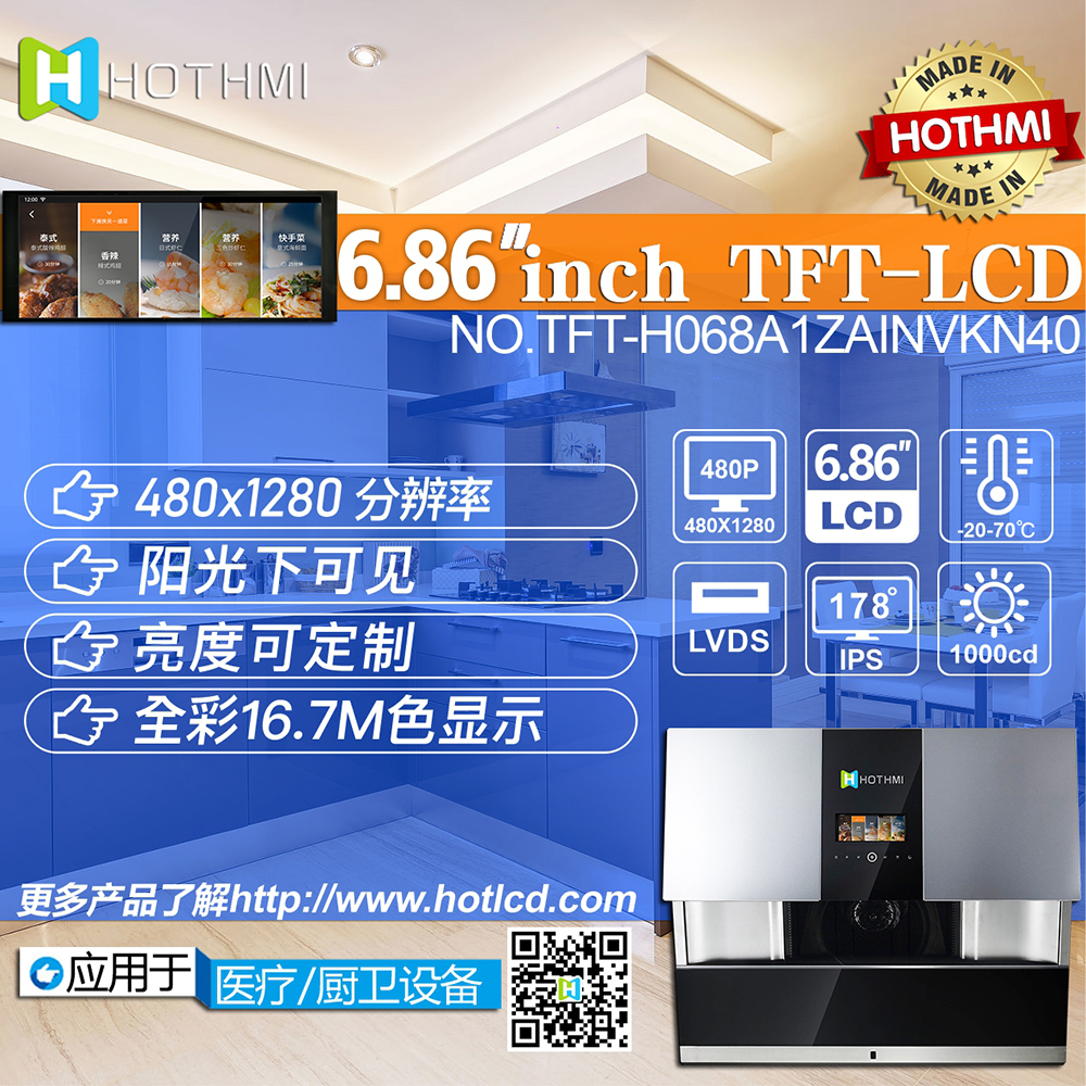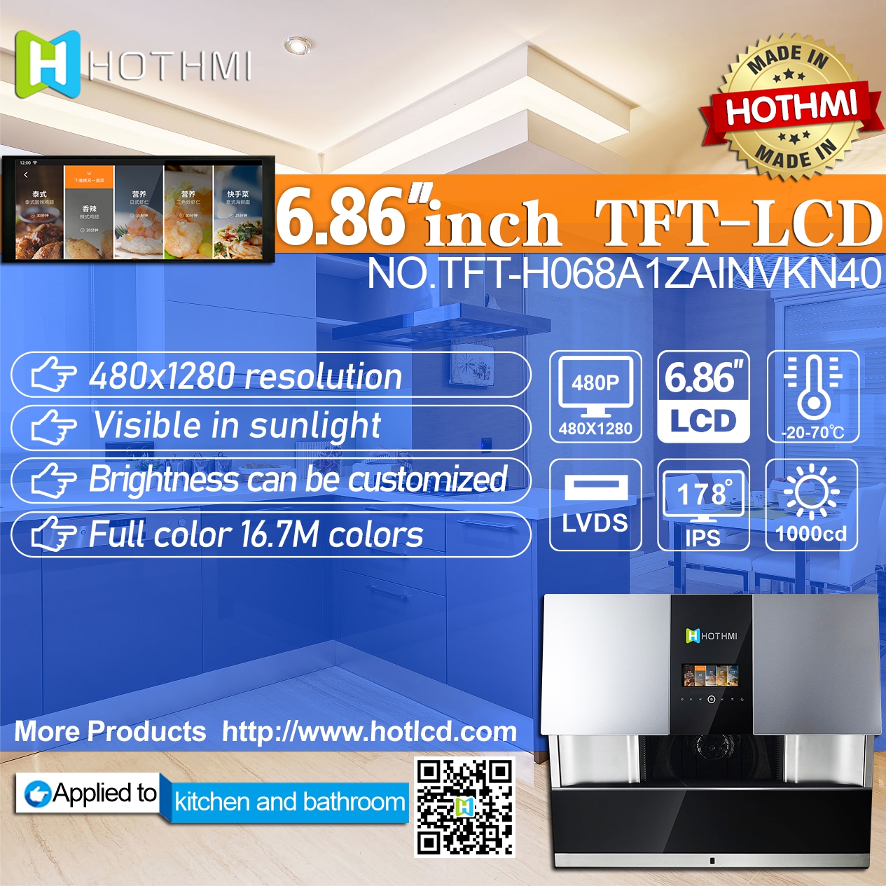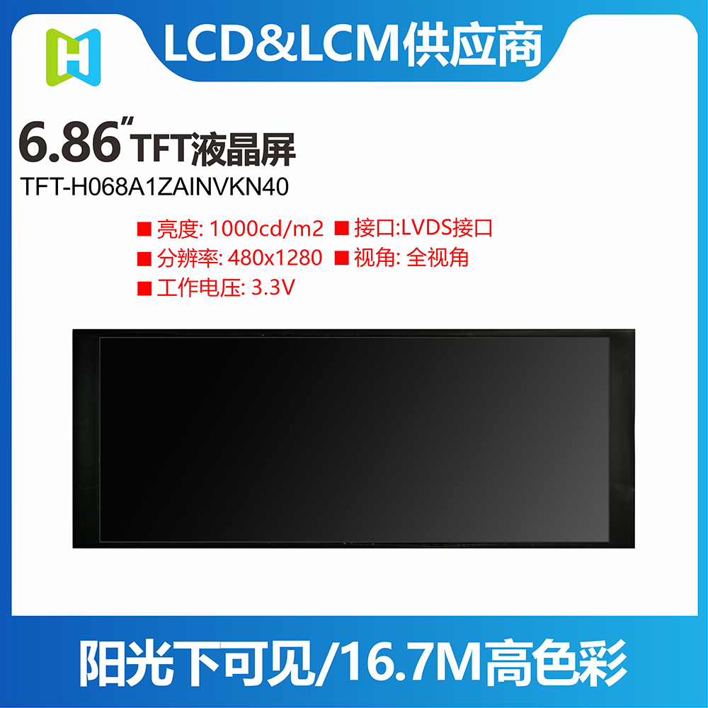 TFT-H068A1ZAINVKN40 is a 6.86-inch TFT LCD module with IPS panel technology. The resolution of this TFT-LCD is 480x1280 pixels. TFT-H068A1ZAINVKN40 module has built-in NV3051F1 driver IC, supports LVDS interface, contrast ratio is 300 (typical value), and module brightness is 1000 nits (typical value). The H068A1 uses IPS panel technology with wider viewing angles than TN glass. Left: 80 / Right: 80 / Top: 80 / Bottom: 80 degrees, vivid colors, high quality picture with saturation and naturalness. The driving voltage of the H068A1 module is 3.3V, ordinary black/translucent liquid crystal, frosted glass, and the screen aspect ratio is 16:9. The module has an operating temperature of -20°C to +70°C and a storage temperature of -20°C to +70°C.