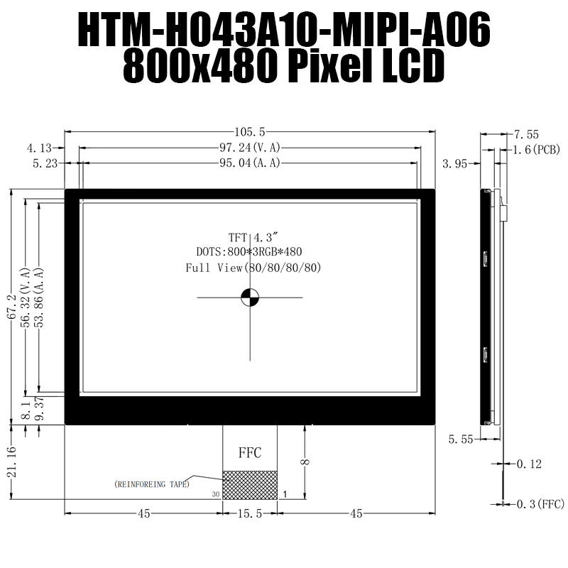 HTM-H043A10-MIPI-A06 | 4.3" IPS TFT LCD Display | TFT LCD Display Manufacturer | 800x480 HD resolution | -30℃~80℃ | For industrial computer | Interface MIPI | Wide Temperature