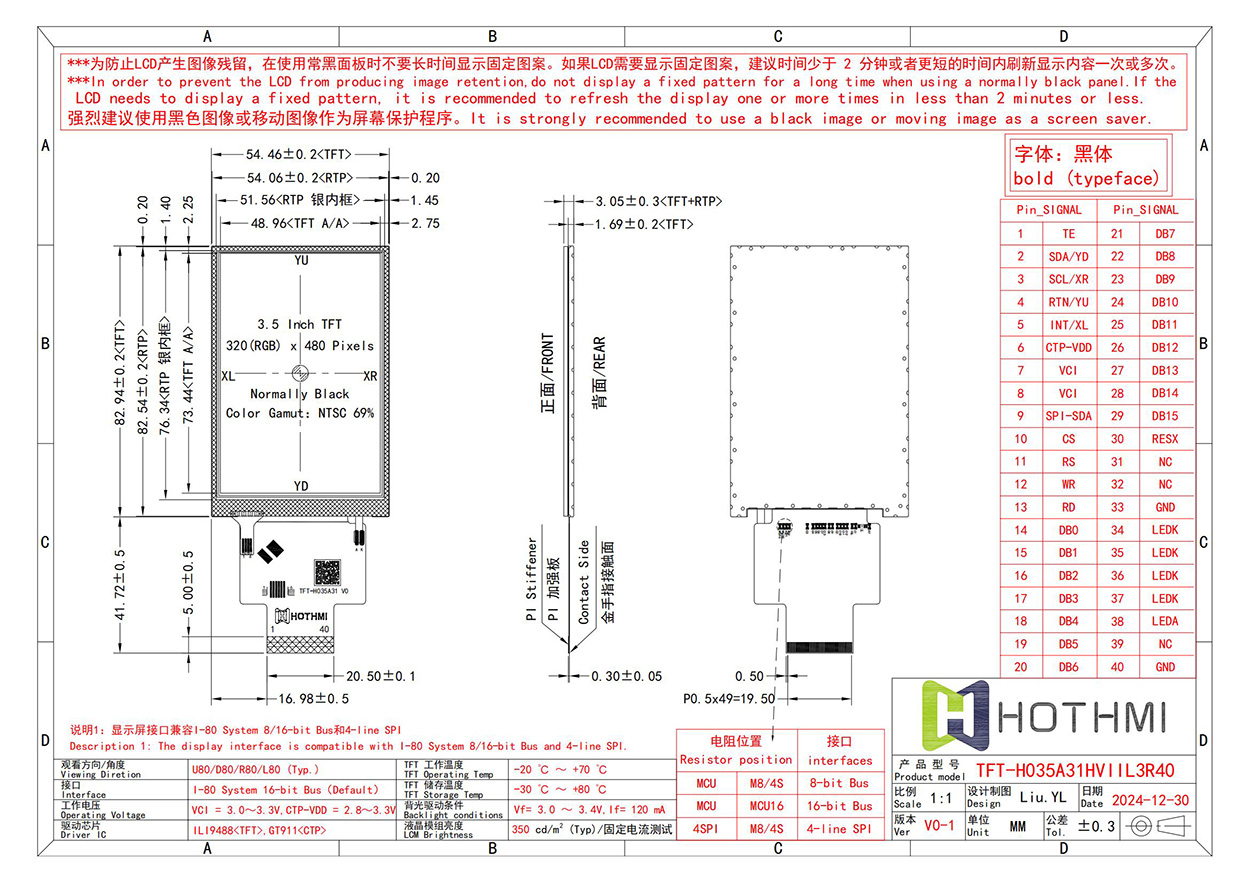 TFT-H035A31HVIIL3R40是一款高性能3.5英寸TFT液晶顯示屏,專為嚴(yán)苛環(huán)境與多樣化應(yīng)用場(chǎng)景設(shè)計(jì)。該產(chǎn)品采用常黑面板(Normally Black)技術(shù),搭配320(RGB)×480像素分辨率,可呈現(xiàn)清晰細(xì)膩的圖像效果,并支持NTSC 69%廣色域,色彩表現(xiàn)生動(dòng)逼真,適用于工業(yè)控制、智能家居及便攜設(shè)備等領(lǐng)域。其工作溫度范圍覆蓋-30℃至+80℃,儲(chǔ)存溫度達(dá)-20℃至+70℃,結(jié)合350 cd/m2的高亮度和VCI寬電壓設(shè)計(jì)(3.0~3.3V),確保在復(fù)雜環(huán)境下穩(wěn)定運(yùn)行。接口兼容I-80 System 8/16-bit總線及4線SPI,適配靈活,便于與多種主控芯片快速集成。產(chǎn)品特別優(yōu)化了防圖像殘留功能,內(nèi)置動(dòng)態(tài)刷新機(jī)制,建議搭配黑色或動(dòng)態(tài)屏保以延長(zhǎng)屏幕壽命。無(wú)論是精密儀器儀表還是消費(fèi)電子產(chǎn)品,TFT-H035A31HVIIL3R40均以卓越的可靠性和適應(yīng)性,為您的顯示解決方案提供強(qiáng)勁支持。