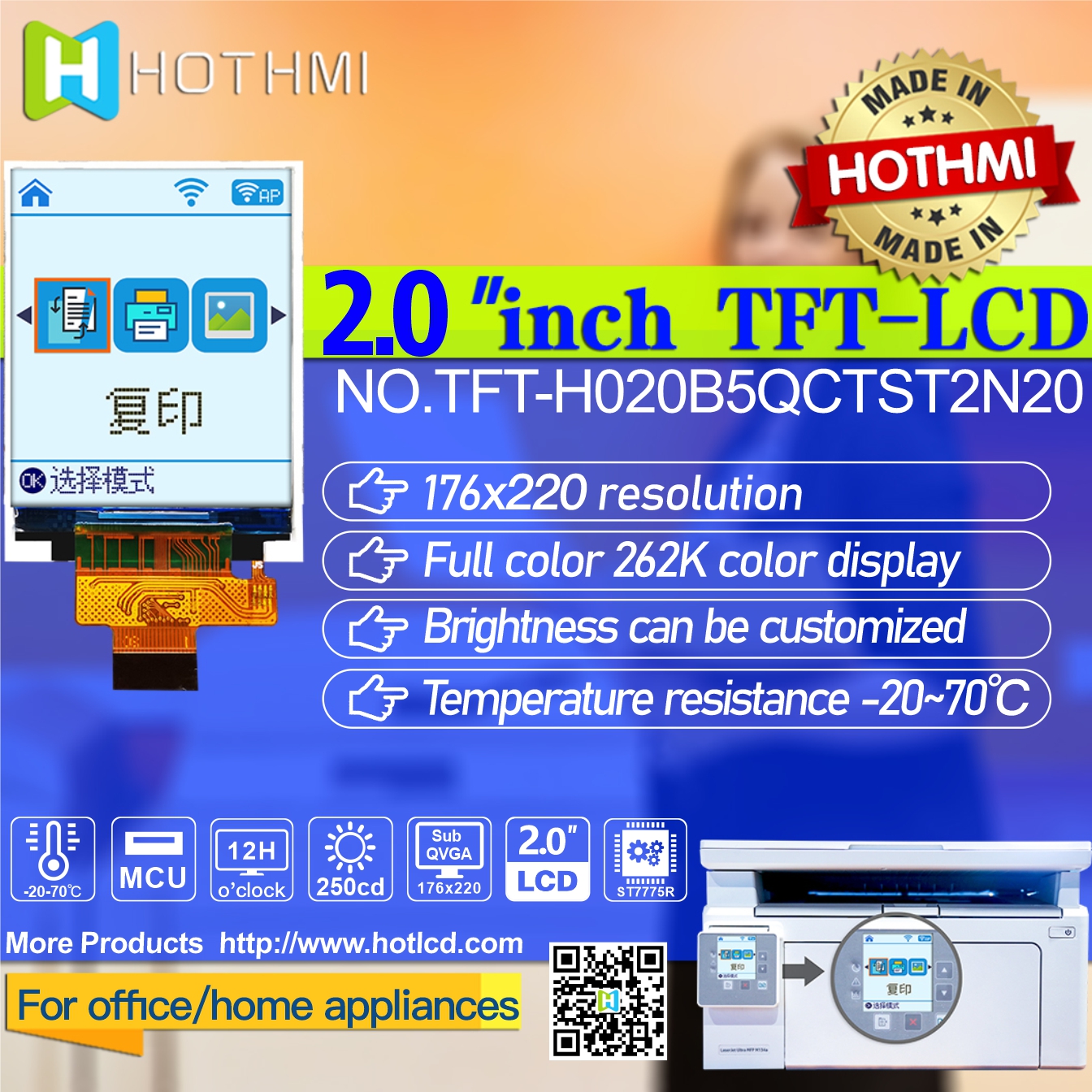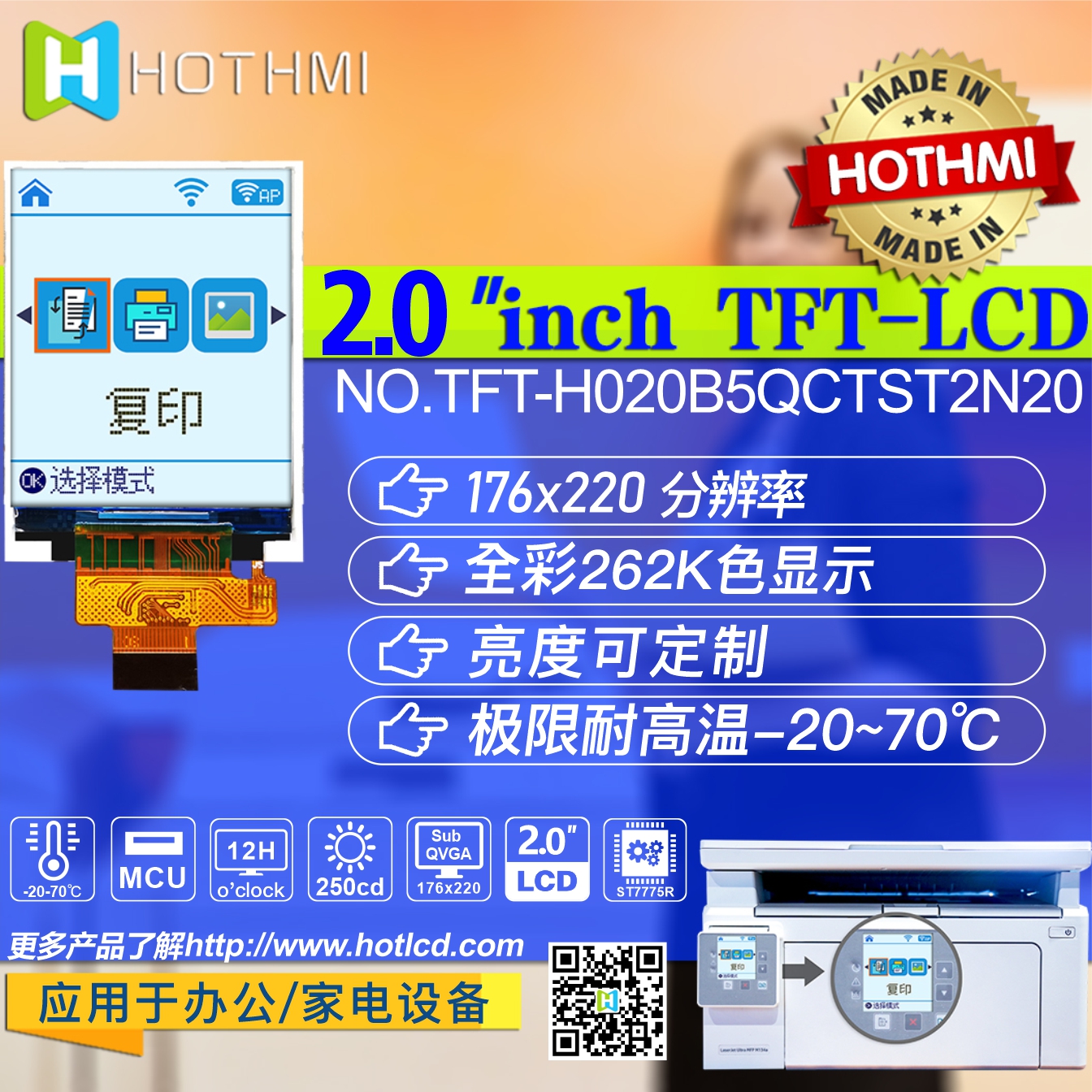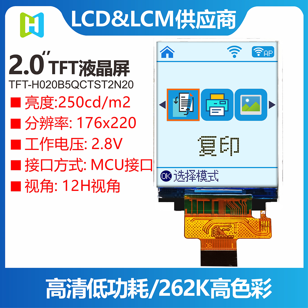 TFT-H020B5QCTST2N20 是鑫洪泰HOTLCD研發(fā)團(tuán)隊(duì)精心設(shè)計(jì)的一款2.0寸豎屏TFT彩色液晶顯示屏,176*220分辨率,12H視角,65K/262K真彩色,內(nèi)置ST7775R控制器,支持MCU 8bit接口,20PIN插接式FPC即可連接主板(可選配連接器),單電源DC3.2V供電.此款TFT模塊可選配觸摸屏,所有材料均符合環(huán)保要求RoHS標(biāo)準(zhǔn),廣泛應(yīng)用于各式儀器儀表、智能設(shè)備、分析儀器、手持式儀器、行車紀(jì)錄儀等, 適用于多種單片機(jī)開發(fā)平臺(tái),如:8051、PIC、AVR、ARDUINO、ARM和樹莓派Raspberry Pi等。