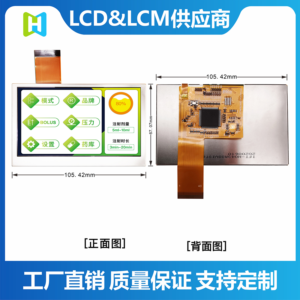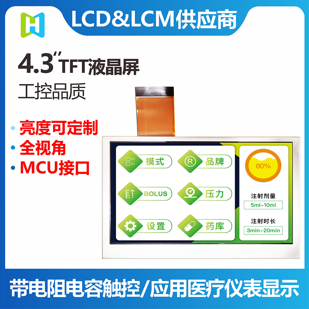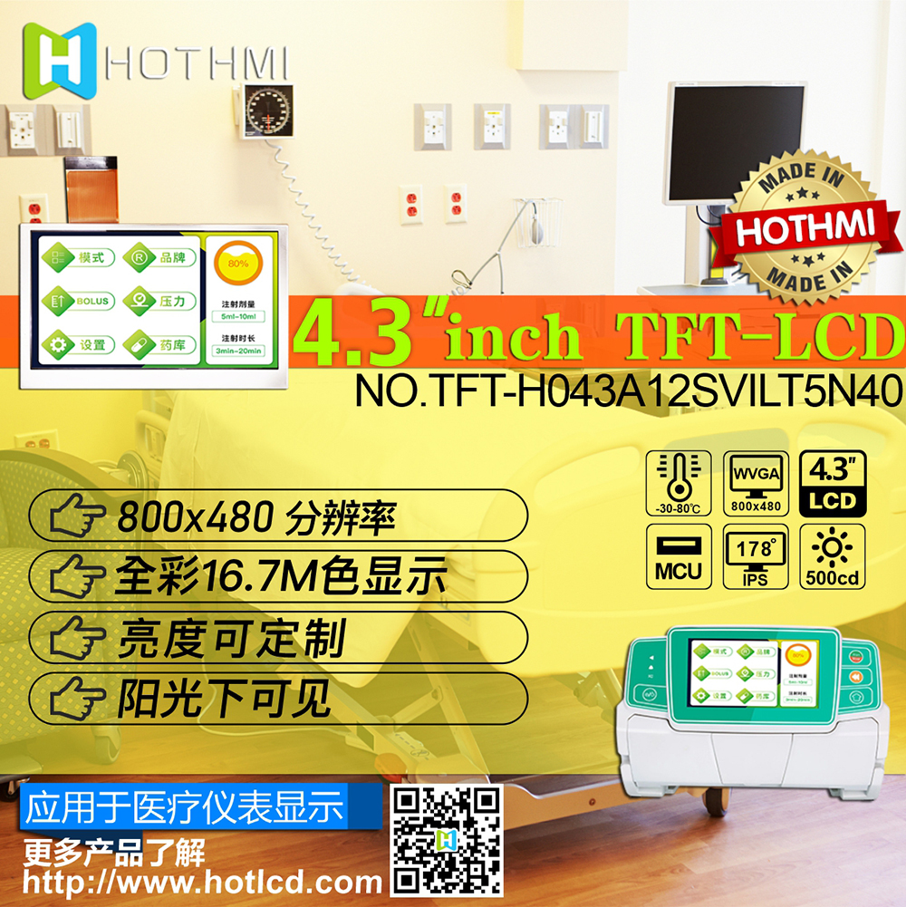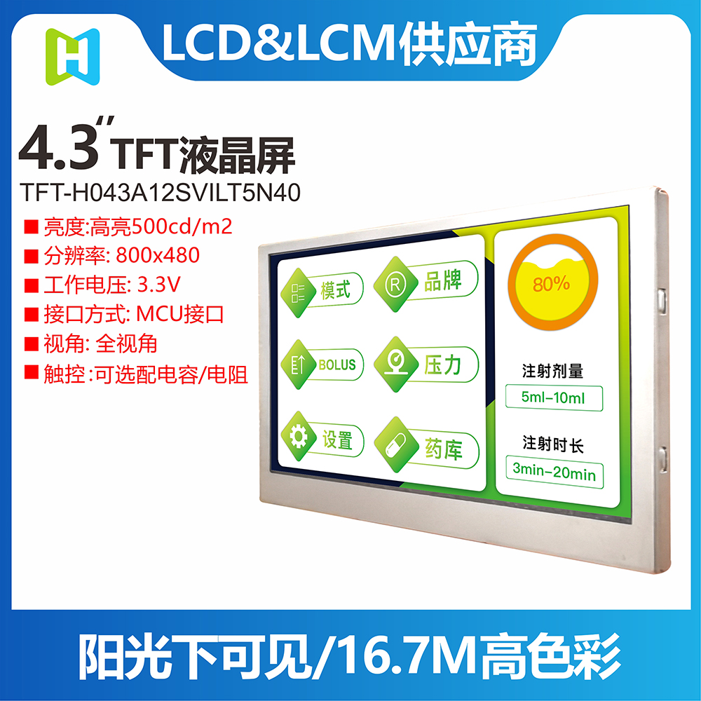 H043A12SVILT5N40是一款4.3寸超廣溫IPS-TFT搭載投射電容式觸控面板(PCAP)顯示器模塊,分辨率為800x480像素。模塊內(nèi)建ST7262+HT7381(TFT),驅(qū)動器IC,支持MCU接口。 H043A12SVILT5N40采用IPS面板技術(shù)具有廣視角左:80 / 右:80 / 上:80 / 下:80度 (典型值);高對比度度800:1(典型值),亮度400 nits(典型值),模塊采用亮面玻璃,屏幕長寬比為16:9。此款搭載的電容式觸控面板內(nèi)建GT911(CTP) IC,支持I2C接口,支持多點觸控功能。 H043A12SVILT5N40電源電壓 (VCC) 為3.0V至~3.6V,典型值為3.3V,模塊工作溫度為-30℃~+80℃,儲存溫度為-30℃~+80℃。此外,H043A1型號同時提供無觸控選項,產(chǎn)品料號為H043A12SVILT5N40。