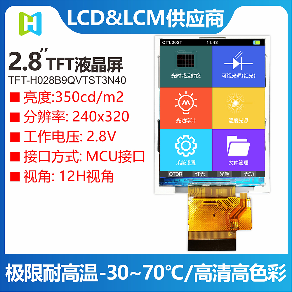 TFT-H028B9QVTST3N40是HOTLCD研發(fā)團隊精心設計的2.8英寸TFT彩色液晶屏,240*320分辨率,高畫質,廣視角,65K/262K真彩色,內置ST7789V控制器,支持MCU接口,40PIN外掛FPC可以接主板(可選接頭),單電源DC 2.8V供電。 TFT 模塊可配備觸摸屏,所有材料均符合 RoHS 標準。 廣泛應用于各種儀表、智能設備、分析儀器、手持儀表、行車記錄儀等:8051、PIC、AVR、ARDUINO、ARM、樹莓派等。