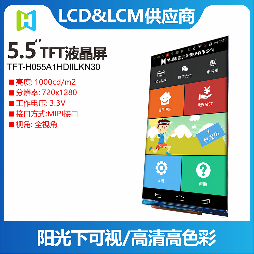TFT-H055A1HDIIL3N30為5.5吋720 x1280全彩HD高畫(huà)質(zhì)的TFT LCD模塊。此款TFT-LCD支持MIPI DSI接口,采用廣視角IPS(In-plane Switching)面板技術(shù),視角范圍為左: 80 / 右: 80 / 上: 80 / 下: 80 度,IPS面板視角廣度廣,色彩鮮明、具有飽和自然的優(yōu)質(zhì)畫(huà)面。此型號(hào)工作溫度為-20℃ 至+70℃,儲(chǔ)存溫度–30℃ 至 +80℃。