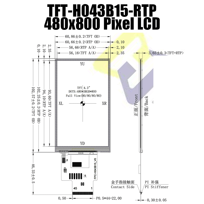 4.3寸TFT IPS全視角 480X800分辨率 LCD電阻觸控屏-TFT液晶模組廠 TFT-H043B15WVIST3R45