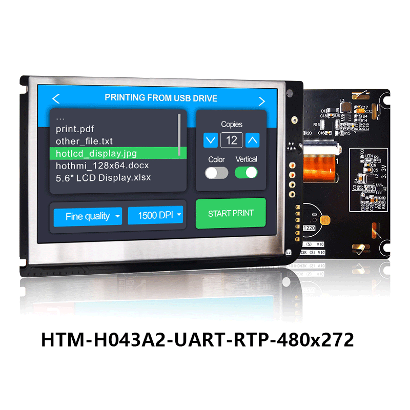隆重推出 HTM-H043A2-A5-UART-RTP,這是 TFT LCD 顯示器領域的工程和設計奇跡。 這款 4.3 英寸 IPS LCD 顯示屏擁有 480x272 像素,以驚人的清晰度和活力讓您的圖像和視頻栩栩如生。