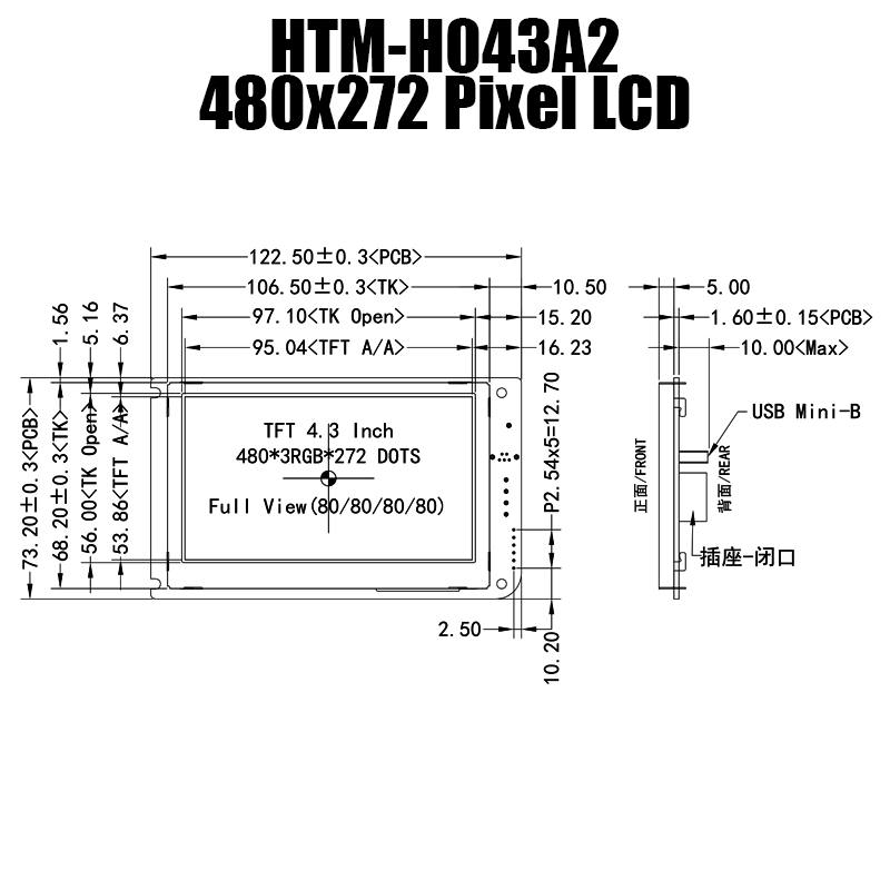 4.3英寸對角線彩色TFT屏,標配無觸摸/電阻觸摸/電容觸摸