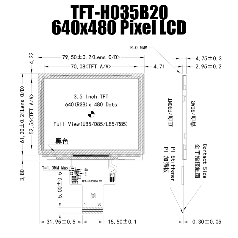 TFT-H035B20VGIST4G30 | 3.5" IPS TFT LCD 顯示屏 | TFT LCD 顯示屏制造商 | 640x480 分辨率 | -30℃~80℃ | 手持式 | 接口 MIPI 4L | 寬溫 | IC ST7703