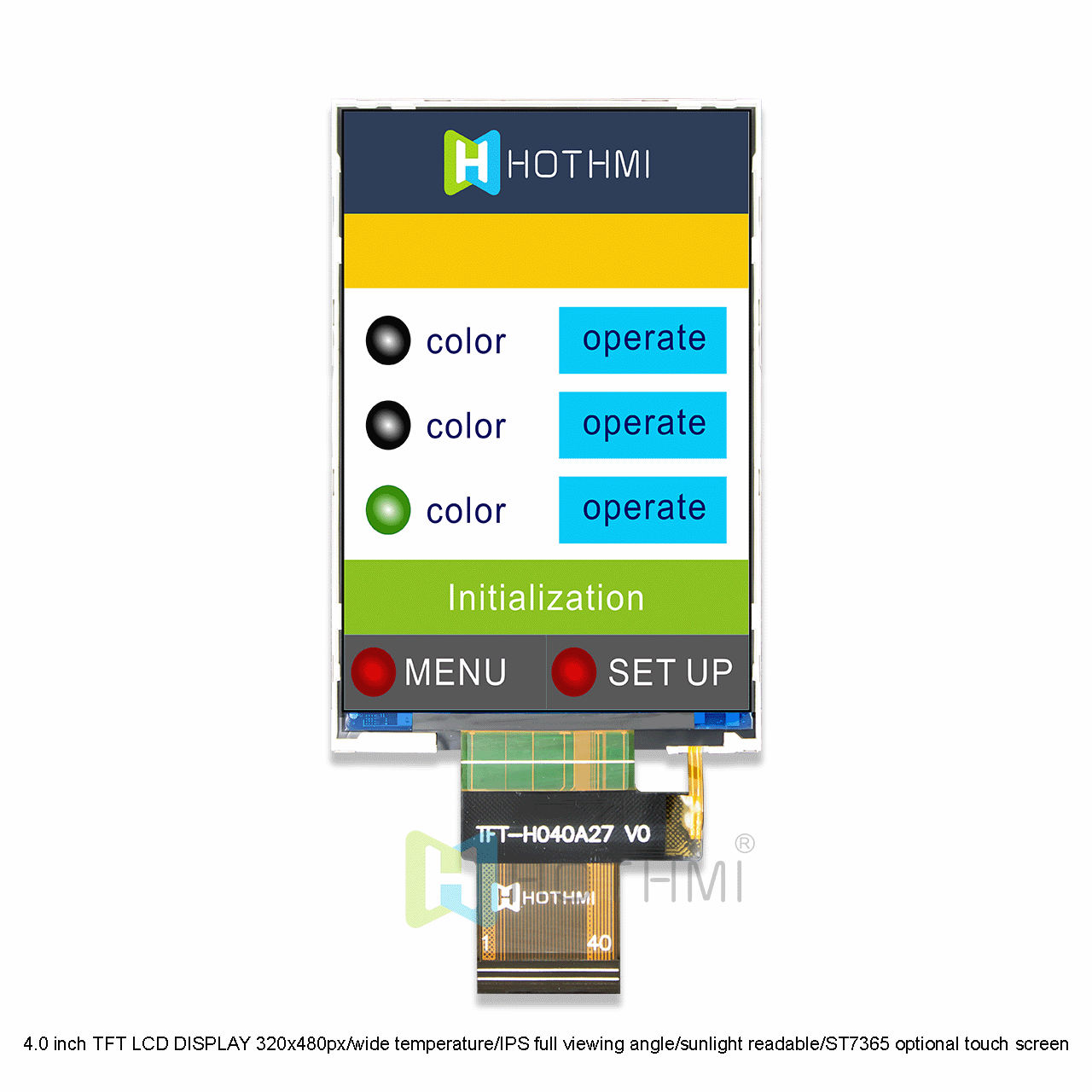 TFT-H040A27FWIST5N40 is a 4.0-inch color LCD module with a 320x480 resolution, built-in ST7365 controller, optional touch screen, and high image quality, IPS wide viewing angle, supporting 8080 8-bit, 9-bit, 16 bit, 18 bit parallel interfaces and 3-wire, 4-wire serial interfaces, 65K/262K true color, FPC connection (optional connector), 2.8V~3.3 voltage, supports vertical display. All materials comply with environmental requirements and RoHS standards. This module is widely used in various instruments, intelligent devices, etc., and is suitable for 8051 PIC, AVR, ARDUINO, ARM, Raspberry Pi and other microcontroller development platforms.