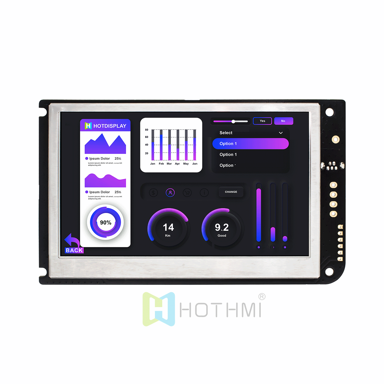 4.3英寸彩色TFT顯示模組/4.3英寸UART智能串口屏/480x272分辨率/IPS全視角TFT帶板模組 HTM-H043A10-A5-UART是一款4.3寸彩色串口顯示屏。它是一款IPS全視角的顯示屏,不管您從哪個方向觀看,都會呈現(xiàn)出良好的效果。標準亮度 LED 背光為 500 尼特,亮度適中。這款透射式 LCD 需要 5V 電壓電源,UART接口,HOTDISPLAY UART 顯示由兩部分組成:串口屏硬件和附帶的串口屏軟件: